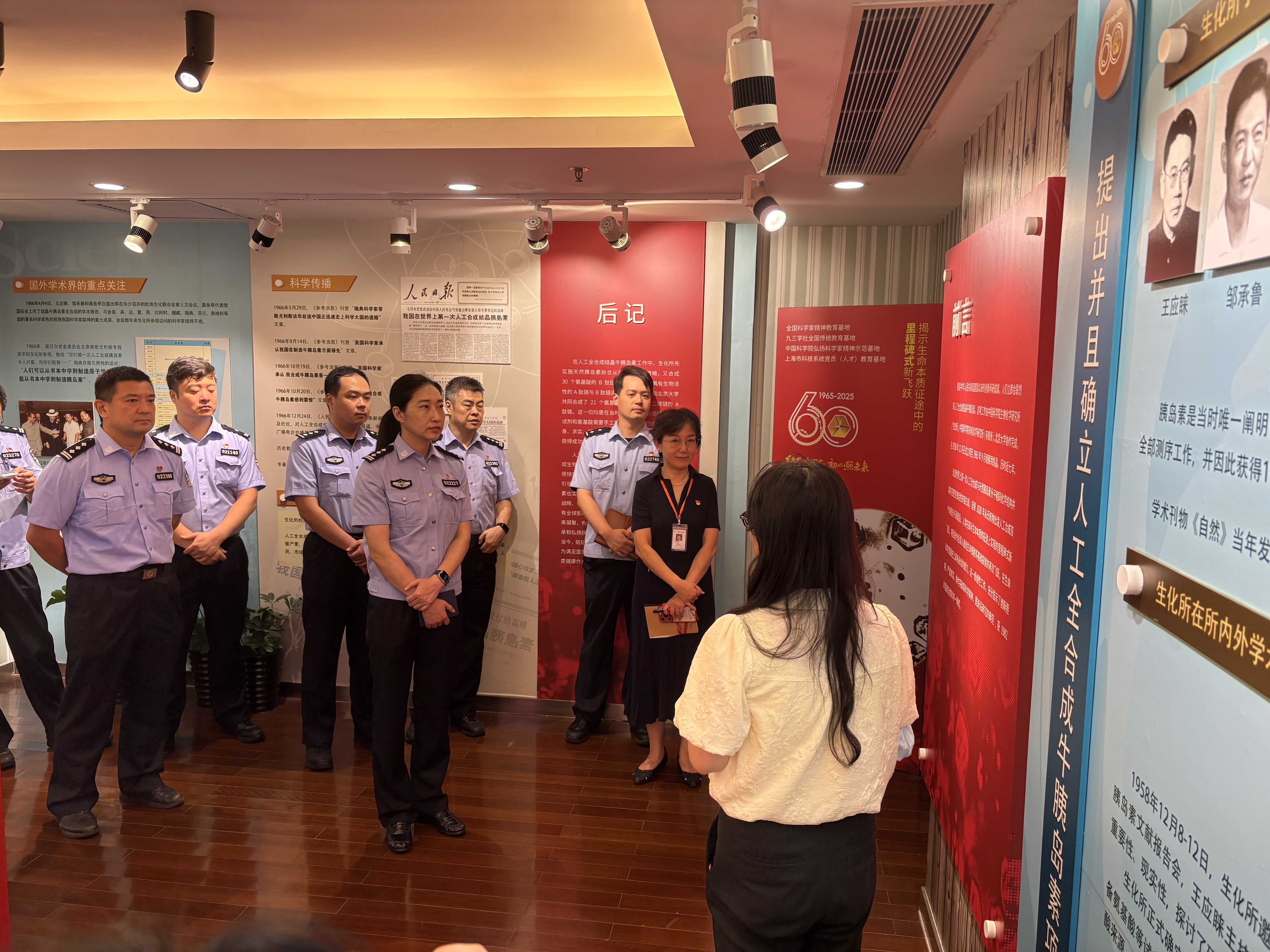 瞻仰展廳里的科學(xué)豐碑。在講解員的引導(dǎo)下,與會黨員參觀了“全國科學(xué)家精神教育基地”——人工全合成結(jié)晶牛胰島素綜合展廳,依次打卡王應(yīng)睞先生塑像、王應(yīng)睞先生辦公室復(fù)原空間、355704號王應(yīng)睞星模型、院士墻和胰島素展廳等,在發(fā)黃斑駁的實(shí)驗(yàn)手稿、陳舊簡陋的實(shí)驗(yàn)器具前駐足瞻仰,一起回顧胰島素合成工作的艱辛歷程,深刻感受這項偉大成果的來之不易。