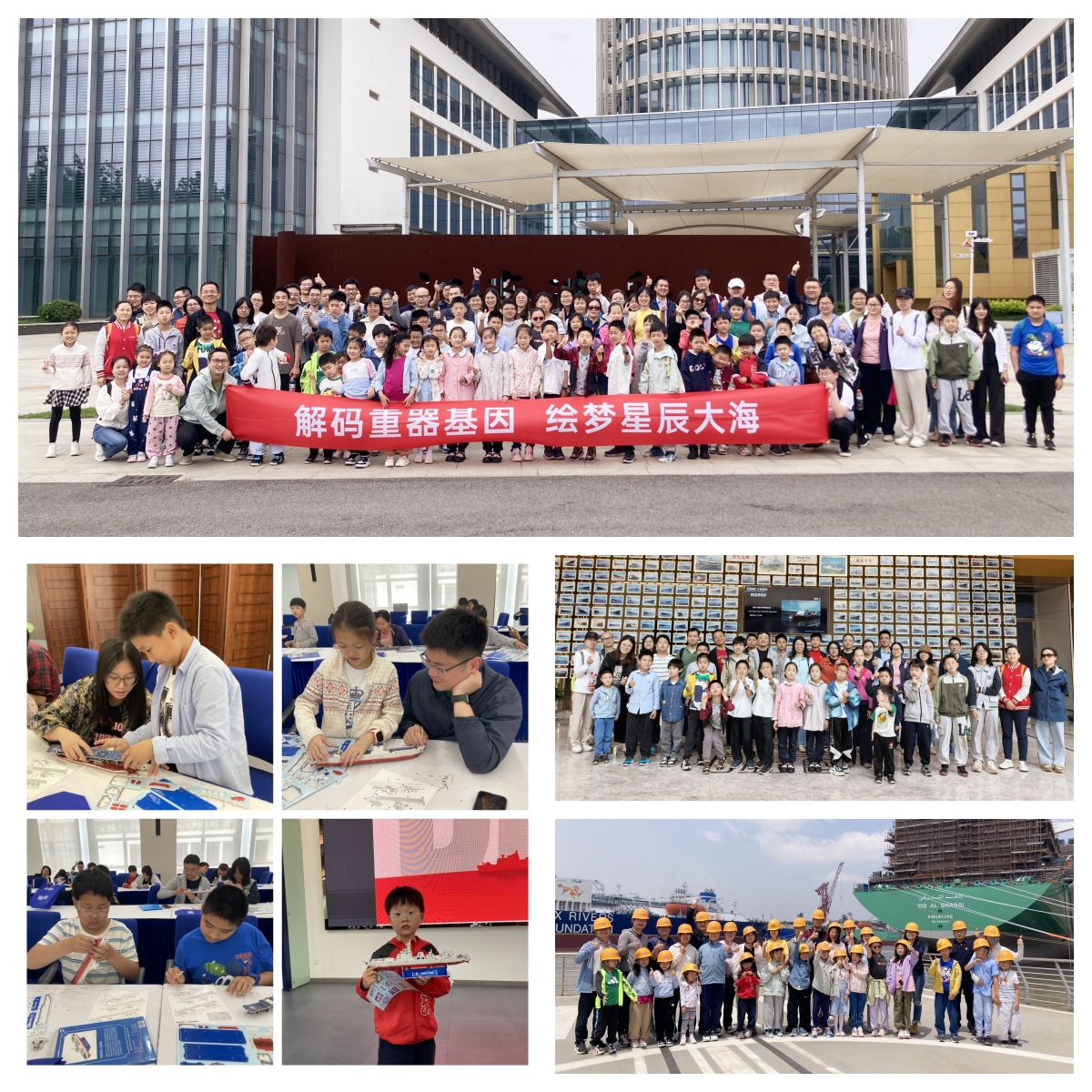隨著大巴駛?cè)腴L(zhǎng)興島,小朋友們一起戴上黃色的安全帽,開(kāi)始了對(duì)這座超級(jí)造船工廠的“基因庫(kù)”探秘之旅。在江南造船展示館,小朋友們跟隨講解員的腳步穿越“時(shí)光隧道”,親歷中國(guó)造船業(yè)的滄桑變遷,聆聽(tīng)百年江南發(fā)展歷史,體會(huì)百年江南人的追夢(mèng)歷程。來(lái)到生產(chǎn)現(xiàn)場(chǎng),抬頭仰望巍峨的現(xiàn)代化船塢和巨型龍門吊,小朋友們親眼目睹鋼鐵巨輪如何在“搭積木”般的分段建造中初具雛形,學(xué)習(xí)先進(jìn)造船知識(shí),探尋世界最大、最先進(jìn)級(jí)別船舶誕生的秘密。在大國(guó)重器實(shí)踐課上,小朋友們還化身船舶工程師,與科學(xué)家父母?jìng)円黄鸾M裝昆明號(hào)驅(qū)逐艦?zāi)P?,拆解船舶結(jié)構(gòu),對(duì)每一個(gè)零件都精益求精,力求最后零誤差拼接。