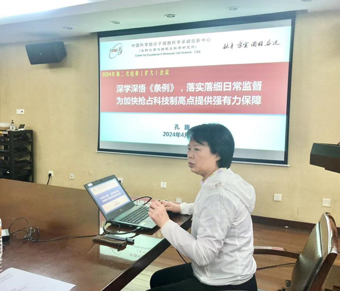在全黨開展黨紀學習教育,是加強黨的紀律建設、推動全面從嚴治黨向縱深發(fā)展的重要舉措。為推動中心紀檢干部在黨紀學習教育中學在先、走在前,帶頭做到學紀、知紀、明紀、守紀,進一步履行好監(jiān)督專責,維護好風清氣正的創(chuàng)新生態(tài),4月30日下午,分子細胞卓越中心舉行紀檢干部黨紀學習教育集體學習培訓。中心紀委委員、黨支部紀檢委員、監(jiān)督審計處工作人員參加了會議。會議由監(jiān)督審計處處長許明敏主持。