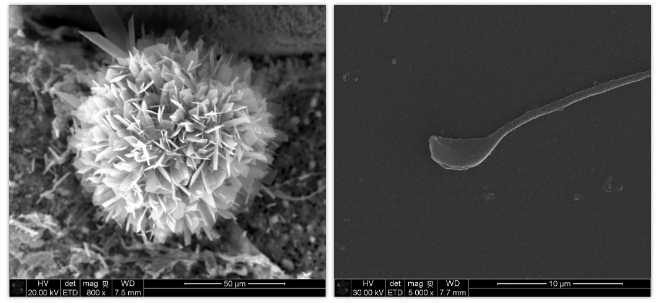 掃描電鏡的圖更像是“描繪顏值”,左圖中這朵50微米大小的“雪絨花”由渦蟲皮膚表面粘液和制樣時的結(jié)晶鹽形成。右圖為單個小鼠精子。