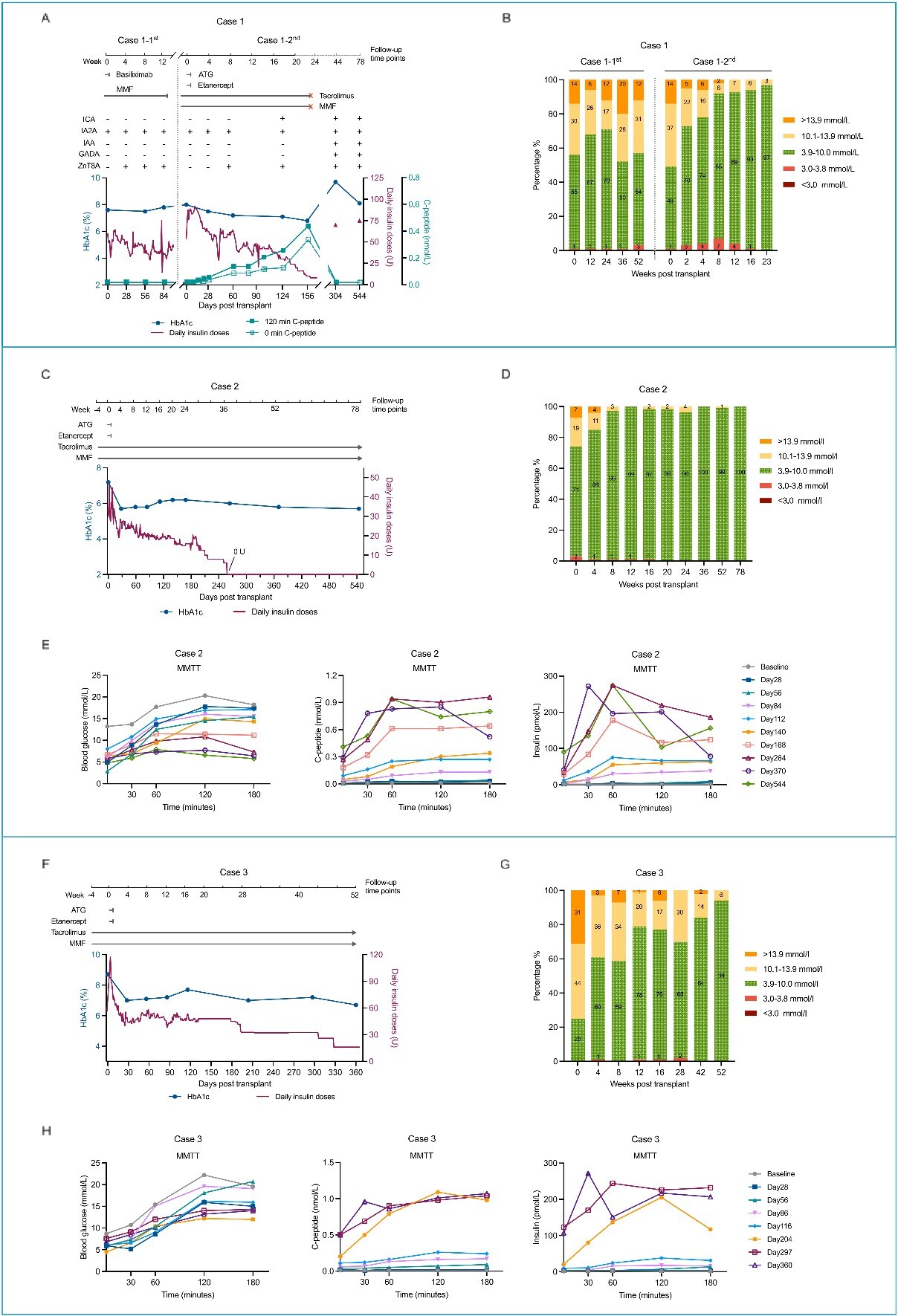 本研究在三例T1D患者中,分別采用自體或異體內(nèi)胚層干細胞來源的再生胰島(E-islet),并在不同免疫抑制策略下評估療效與安全性,取得了鼓舞人心的臨床結(jié)果。