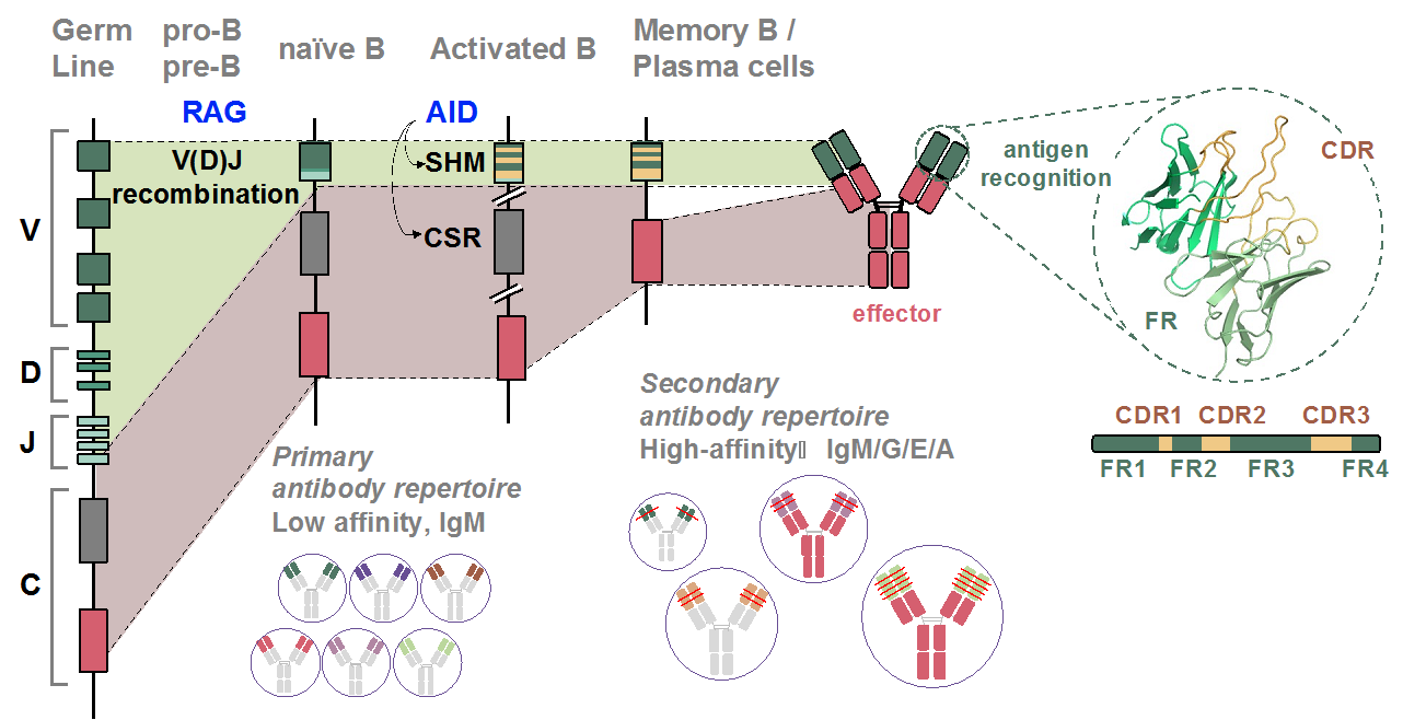 基因組編碼的遺傳信息是生命活動的基礎(chǔ),而生命活動又常伴隨著DNA損傷的被動發(fā)生,因此生物進化出多套機制維持其穩(wěn)定性。而“禍福相依”,特定細(xì)胞會主動發(fā)生基因組DNA變異,改變編碼信息,獲得新的功能。適應(yīng)性免疫系統(tǒng)中抗原受體多樣性產(chǎn)生即是哺乳動物中少數(shù)的DNA程序性變異過程之一。在應(yīng)對復(fù)雜的生存環(huán)境中,免疫B淋巴細(xì)胞經(jīng)歷一系列的基因重排、高頻突變、DNA重組等過程,產(chǎn)生高效親和力抗體分子。B細(xì)胞特異性DNA脫氨酶AID起始了抗體基因程序性DNA斷裂或突變,最終,單一的DNA序列轉(zhuǎn)化為天文數(shù)字的抗體基因。免疫多樣化的缺陷會導(dǎo)致各種原發(fā)性免疫缺陷疾病,而程序性DNA損傷的錯誤調(diào)控也會造成其它基因上的DNA損傷,導(dǎo)致免疫系統(tǒng)腫瘤的發(fā)生發(fā)展。