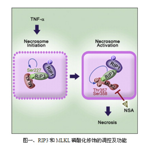 程序性細胞壞死是一種由激酶的激活而引發(fā)的細胞死亡方式。死亡受體(例如TNFR1)的激活最終可以誘發(fā)程序性細胞壞死,而起動細胞壞死的信號轉(zhuǎn)導主要依賴于激酶RIP1和RIP3的調(diào)控。細胞壞死發(fā)生之后,RIP1與RIP3相結(jié)合并激活了RIP3的激酶活性,然后RIP3發(fā)生自身磷酸化,使其可以特異性的和底物MLKL相結(jié)合,MLKL進而被RIP3磷酸化。這時的RIP1/RIP3/MLKL形成一個有活性的細胞壞死復合體,傳遞死亡信號給下游,使細胞壞死得以最終發(fā)生。