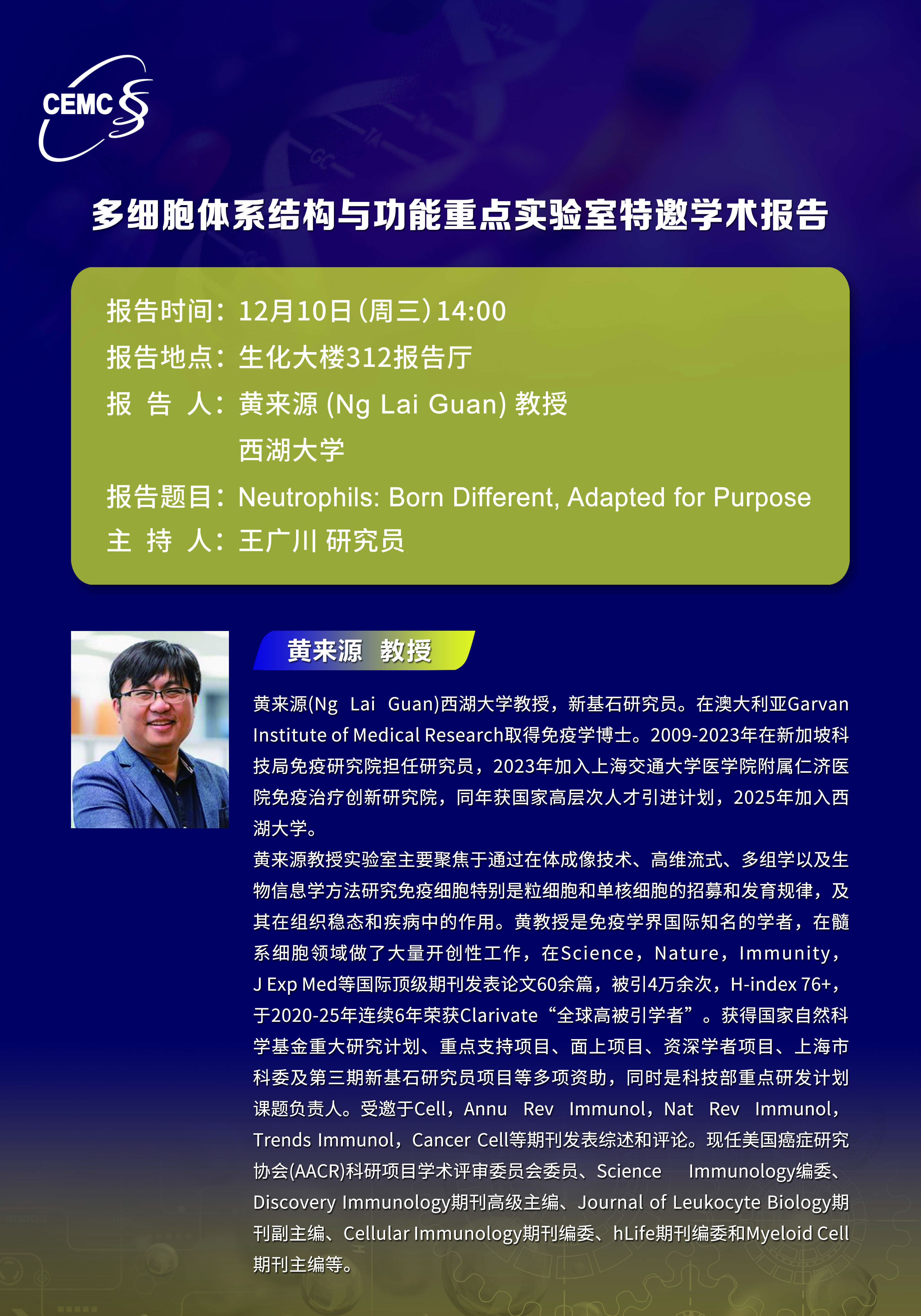 西湖大學(xué)?黃來(lái)源?教授:Neutrophils: Born Different, Adapted for Purpose